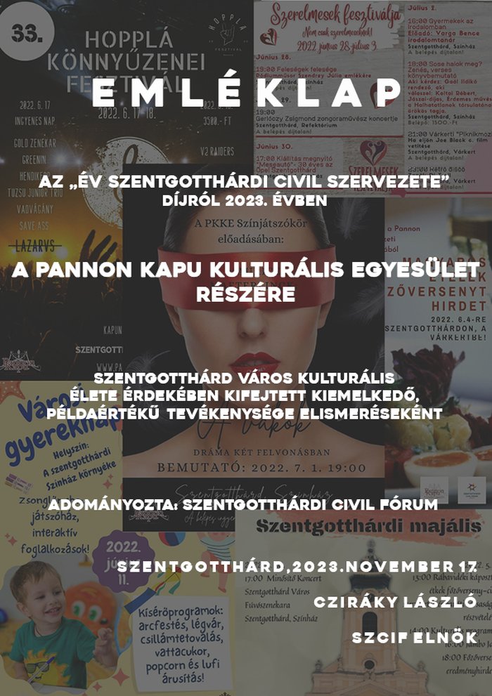 A Pannon Kapu Kulturális Egyesület 2023-ban elnyerte az "Év civil szervezete díjat" Szentgotthárd városban. Ez a díj az egyesület hosszú éveken át tartó kulturális tevékenységének elismeréseként került átadásra.